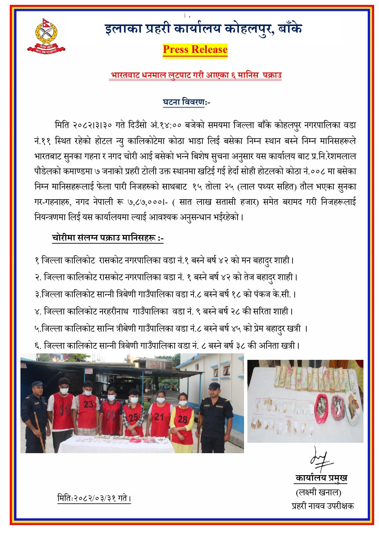 नेपालगञ्ज —भारतबाट चोरी गरेर ल्याएको १५ तोला २५ लाल सुनका गरगहना र सात लाख ८७ हजार नगदसहित छ जनालाई कोहलपुर प्रहरीले पक्राउ गरेको छ । भारतबाट सुनका गहना र नगद चोरेर कोहलपुरस्थित होटेल न्यू कालीकोटेमा बसेको भन्ने विशेष सूचनाका आधारमा प्रहरी निरीक्षक रेशमलाल पौडेलको नेतृत्वमा गएको टोलीले उनीहरूलाई पक्राउ गरेको हो । इलाका प्रहरी […]