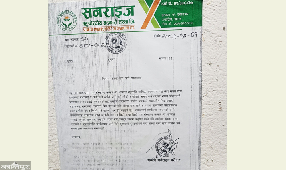 तिलोत्तमा/ईकान्तिपुर— बुटवलको देवीनगरस्थित सनराइज बहुउद्देश्यीय सहकारी संस्थाका अध्यक्ष र कोषाध्यक्ष फरार भएपछि बचतकर्ताको बिचल्ली भएको छ । बचतकर्ताको ठूलो रकम संकलन गरेको सहकारीका अध्यक्ष वसन्त भट्टराई र कोषाध्यक्ष आकाश भट्टराई एकाएक सम्पर्कविहीन भएपछि बचतकर्तालाई समस्या परेको हो । सहकारीले दैनिक पैसा संकलन गर्ने र बचत गर्ने गरेको थियो । २०७८ सालमा लुम्बिनी प्रदेशमा दर्ता […]