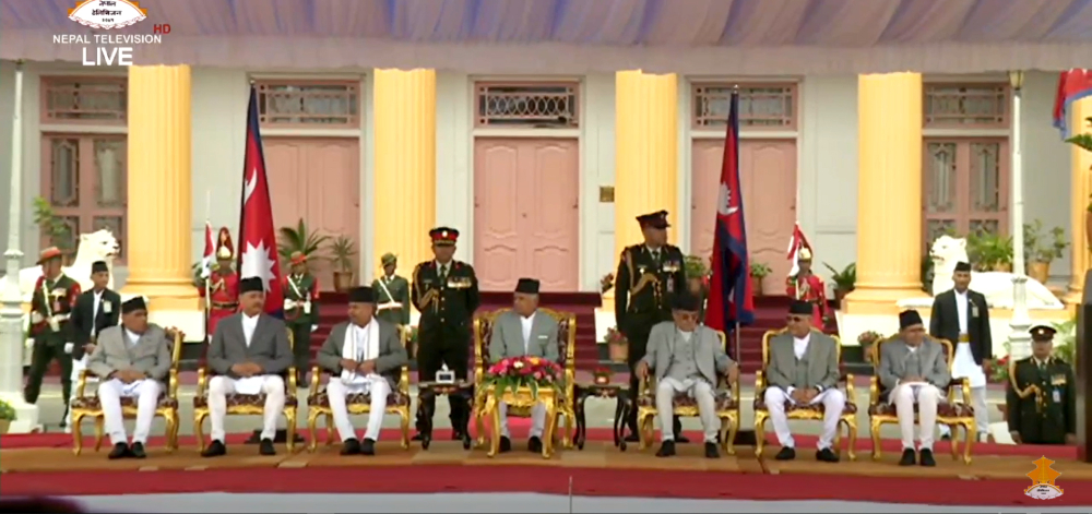 काठमाडौँ, असार ३० गते। प्रधानमन्त्री केपी शर्मा ओलीले पद तथा गोपनीयताको शपथ आज सोमबार बिहान लिनुहुने भएको छ।उहाँले राष्ट्रपति रामचन्द्र पौडेलसमक्ष सोमबार बिहान ११ बजे शपथ लिनुहुने विशेष कार्यक्रम रहेको राष्ट्रपति कार्यालयले जानकारी दिएको छ। राष्ट्रपति कार्यालयले प्रधानमन्त्रीको शपथमा उपस्थित हुने सांसदलाई सोमबार बिहान साढे १० बजेभित्र शीतल निवास प्रवेश गरिसक्न अनुरोध गरेको छ। […]