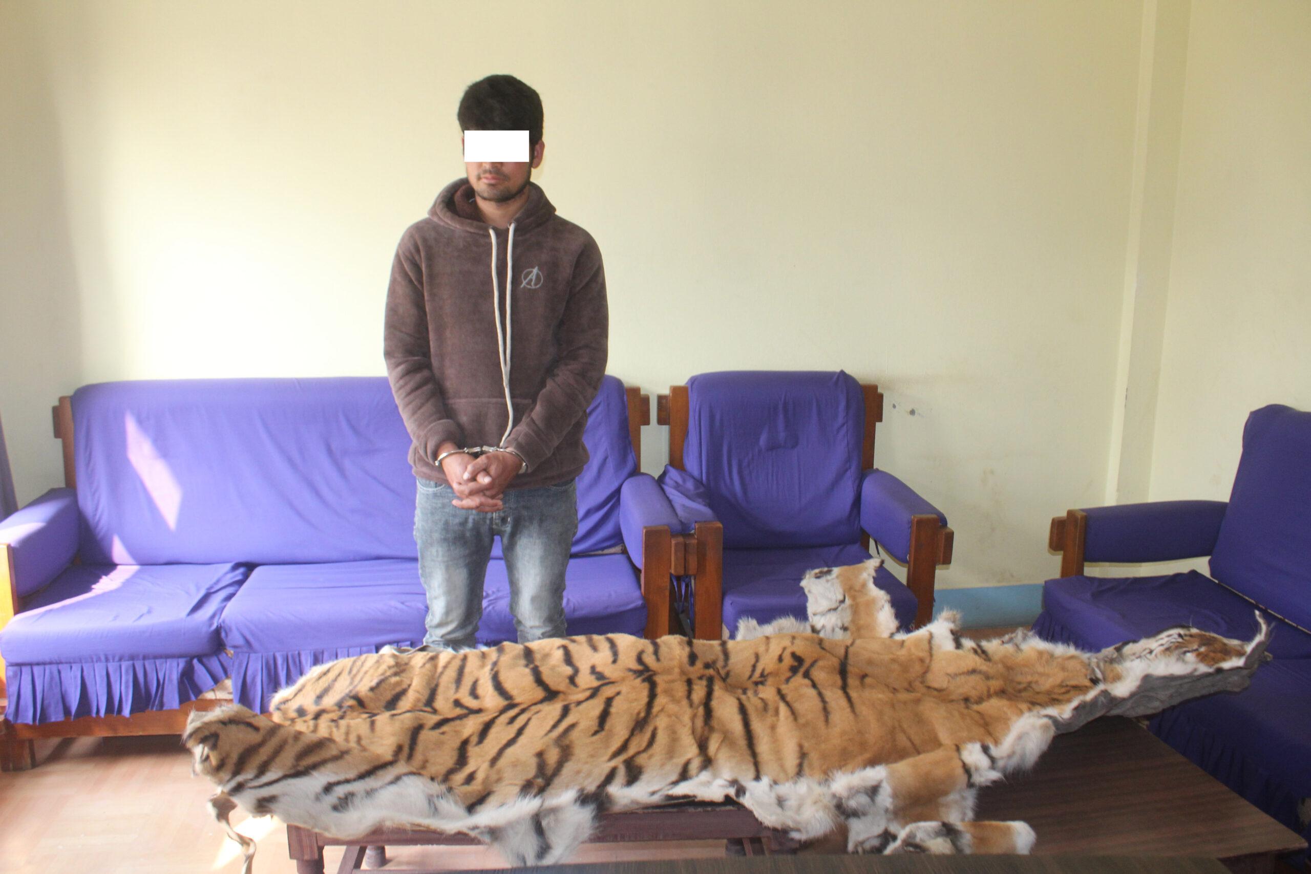 नेपालगन्ज । बांके प्रहरिले दुर्लभ बन्यजन्तु पाटे बाघको छाला सहित सुर्खेत का २८ बर्षिय चन्द्र बहादुर कार्की पक्राउ परेका छन । उनलाई नेपालगन्ज बसपार्क स्थित होटेल माहाबु बाट आज १.३० मा प्रहरी निरीक्षक सुजन बिक्रम शाह को कमान्डमा छालासहित पक्राउ गरेको हो ।