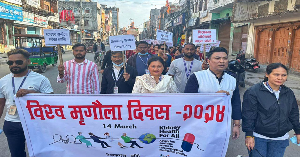 नेपालगन्ज । नेपालगन्जमा ‘मिर्गौला उपचारमा सबैको समान पहुँच र सुरक्षित चिकित्सकीय अभ्यास’ भन्ने मूल नाराका साथ विभिन्न कार्यक्रम गरेर विश्व मिर्गौला दिवस बिहीबार मनाइएको छ । नेपालगन्ज उपमहानगरपालिकाले दिवसको अवसरमा बिहान नगरमा प्रभातफेरी आयोजना गरेको थियो । उपमहानगरपालिका परिसरबाट सुरु भएको प्रभातफेरी गणेशमान चोकमा पुगेर समापन भएको थियो । समापन कार्यक्रममा बोल्दै नेपालगन्ज उपमहानगरपालिकाका […]