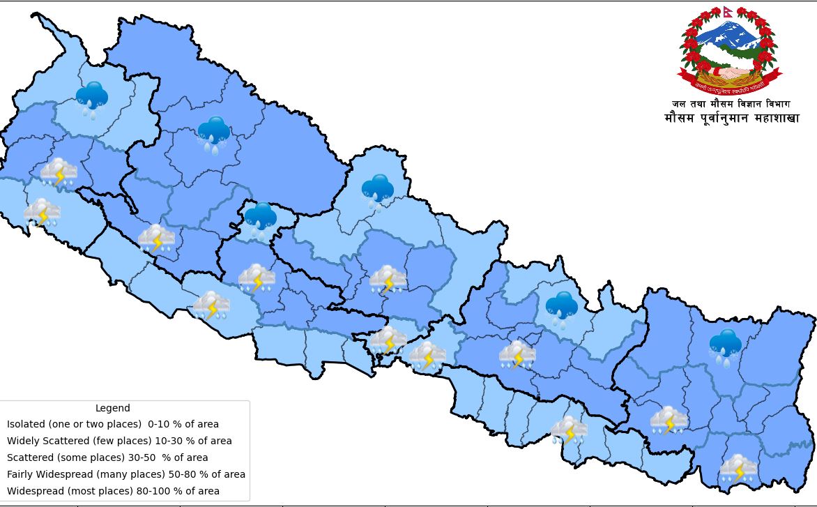 काठमाडौं, ८ बैशाख । हाल देशमा मूख्यतया स्थानीय वायु तथा पश्चिमी वायुको प्रभाव रहेको छ। साथै बिहार आसपास रहेको न्युन चापिय रेखाको पनि प्रभाव रहेको छ। जल तथा मौसम विज्ञान विभाग, मौसम पूर्वानुमान महाशाखाका अनुसार बागमती प्रदेश, गण्डकी प्रदेश, लुम्बिनी प्रदेश र कर्णाली प्रदेशमा आंशिक देखि साधारणतया बदली रही बाँकी भू-भागमा मूख्यतया सफा […]