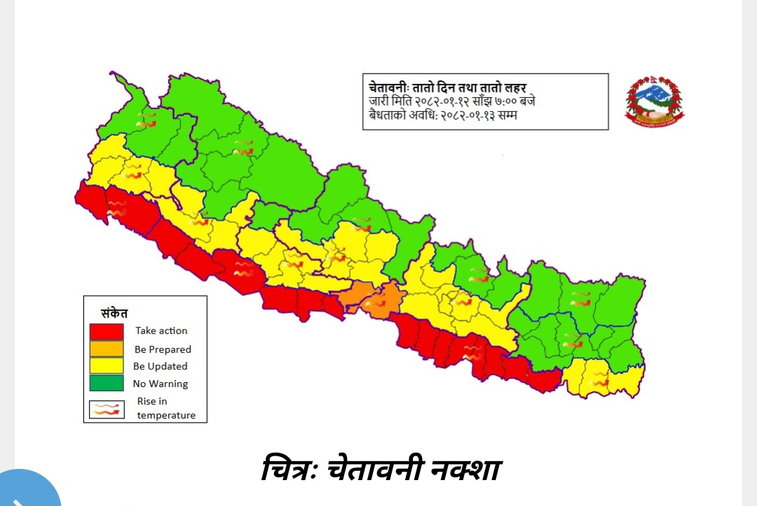 लुम्बिनी प्रदेश र सुदुरपश्चिम प्रदेशका तराई भू-भागका थोरै स्थानहरूमा बिगत केही दिन देखि अधिकतम तापक्रम ४० डिग्री सेल्सियस वा सो भन्दा बढी मापन गरिएको छ । साथै आज मधेश प्रदेश लगायत बागमती प्रदेश, गण्डकी प्रदेश र लुम्बिनी प्रदेशका तराईका एक-दुई स्थानहरुमा ४० डिग्री सेल्सियस र धेरै स्थानहरूमा ३९ डिग्री सेल्सियस वा सो भन्दा बढी मापन […]