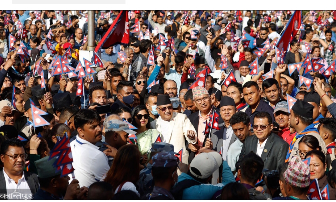 काठमाडौँ — संविधान दिवसको अवसरमा नेकपा (एमाले)ले काठमाडौंस्थित नक्सालको नारायणचौरमा राष्ट्रिय झण्डासँग सेल्फी कार्यक्रमको आयोजना गरेको छ । हरेक वर्ष असोज ३ गते पर्ने संविधान दिवसलाई यस वर्ष भने राष्ट्रिय झण्डासँग सेल्फी कार्यक्रमको आयोजना गरी मनाइएको एमालेले जनाएको छ । कार्यक्रममा एमाले अध्यक्ष केपी शर्मा ओलीसहित विभिन्न नेताहरू सहभागी भएका छन् ।