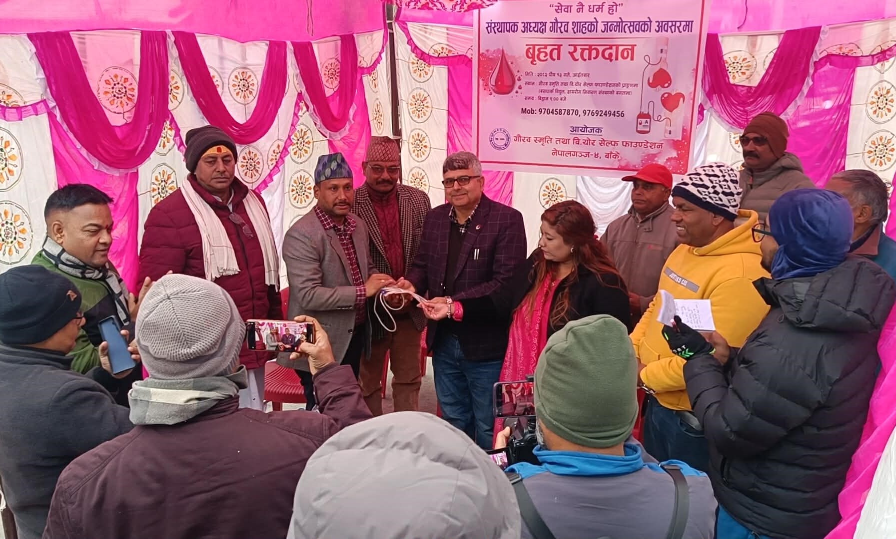 नेपालगन्ज÷(बाँके) । “सेवा नै धर्म हो” भन्ने मूल नाराक साथ गौरव स्मृति तथा वीयोर सेल्फ फाउण्डेशनको आयोजनामा पौष १३ गते भएको रक्तदान कार्यक्रममा १२ महिला र ८९ पुरुष गरी १०१ जनाले रक्तदान गरेका छन् । फाउन्डेशनका उपाध्यक्ष करण शाहद्वारा सञ्चालित कार्यक्रममा फाउन्डेशनका अध्यक्ष मधु शाहको अध्यक्षमा सम्पन्न कार्यक्रममा नेपालगन्ज उप–महानगरपालिकाका मेयर तथा कार्यक्रमका प्रमुख अतिथि […]