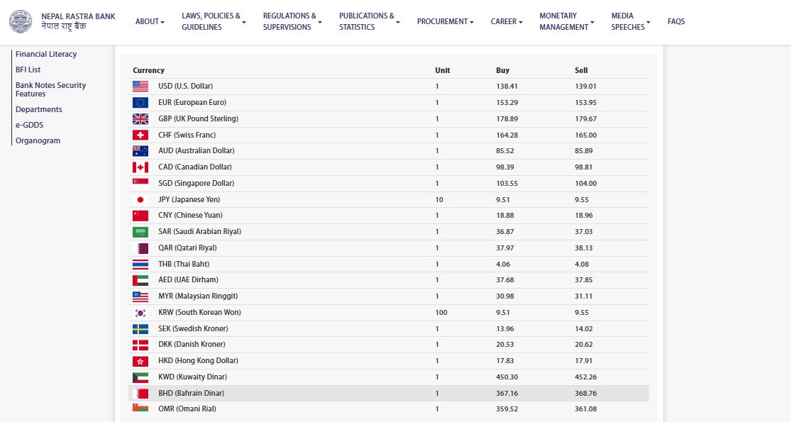 काठमाडौ, चैत्र २९ । नेपाल राष्ट्र बैंकले शुक्रबारका लागि विदेशी मुद्राको विनिमयदर सार्वजनिक गरेको छ । जसअनुसार भारतीय रूपैयाँ १०० को खरिद दर १६० रूपैयाँ हुदाँ बिक्री दर १६०.१५ पैसा कायम गरिएको छ । नेपाल राष्ट्र बैंकले सार्वजनिक गरेको विनिमय दर अनुसार आज एक अमेरिकी डललको खरिददर १३८ रूपैयाँ ४१ पैसा र बिक्रीदर १३९ […]