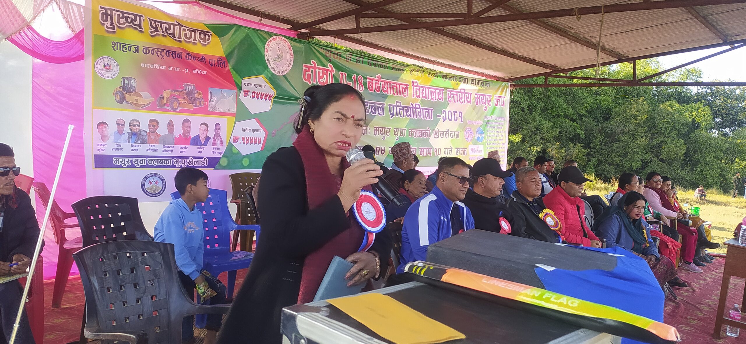 यूवा नै हो देशको शान सबैले गरौ खेलकुदमा योगदान भन्ने मुल सन्देशका साथ मयुर यूवा क्लबको खेल मैदानमा शुक्रवार भएको उद्धघाटन कार्यक्रमका बिशिष्ठ अतिथि तथा बढैयाताल गाउँपालिकाकी उपाध्यक्ष लक्ष्मी कुमारी अधिकारीले खेलका माध्ययम वाट राष्ट्रिको पहिचान बनाउने भएकोले खेलाडी लाई खेल प्रति उत्प्रेरणा बढाउन तिनै तहका सरकारको ध्यान जानु पर्नेमा जोड दिइन ।