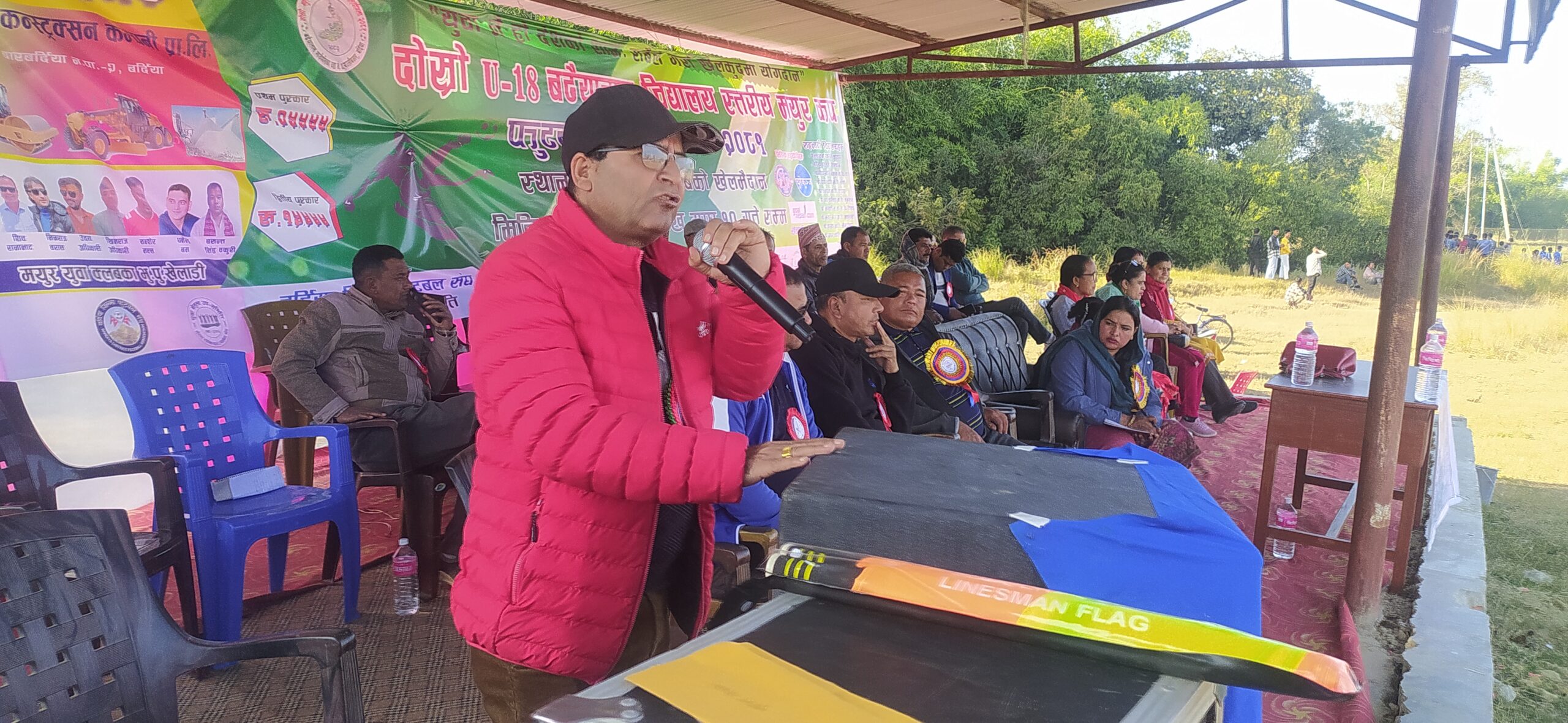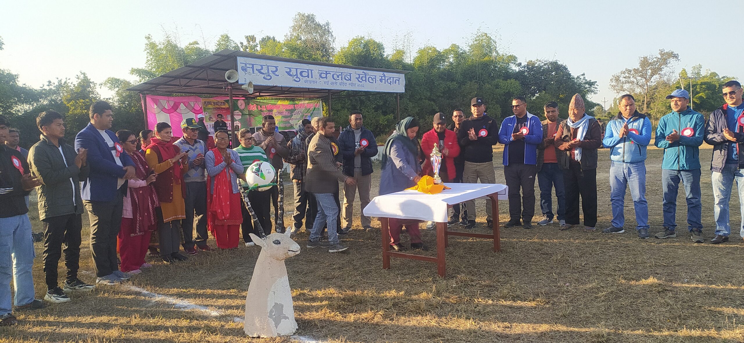 मयुर युवा क्लबका अध्यक्ष इश्वर रानाको अध्यक्षतामा भएको उद्धघाटन कार्यक्रममा बढैयाताल गाउँपालिका ८ न. वडाका अध्यक्ष तेजनाथ पौडेलले स्वागत मन्तब्य राख्दै प्रतियोगिता लाई सभ्य र भब्य रुपमा सफल पार्न सबैको जिम्मेवारी भएको बताए । खेलका संरचना, खेल मैदानका पुर्वाधार, खेल सामाग्रीका साथै खेलमा देखिएका पछिल्लो प्रबिधिहरु लाई जबसम्म भित्र्याउन सक्दैनौ र त्यस लाई बुझ्दौनौ तब सम्म खेलको साँचो अर्थमा विकास नहुने भन्दै तिनै तहका सरकार , एन्फा र सरोकार वाला निकायको ध्यान जानु पर्नेमा वडाध्यक्ष पौडेलले जोड दिए ।