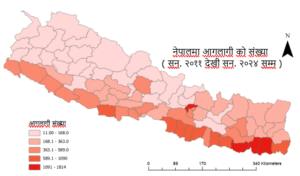 तलको नक्सामा गृह तथा मामिला मन्त्रालयले आफ्नो प्रकोप पोर्टलमा राखेको कुल २८ हजार १२४ आगलागीका घटनालाई आर्क जिआइएस प्रो विधिमार्फत् नक्सामा उतारिएको छ, जसले नेपालमा आगलागीका घटनाको स्थानीय वितरणको ढाँचालाई देखाउँछ।