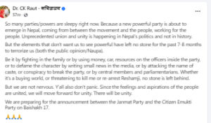 धेरै पार्टी र शक्तिहरूको अहिले निद्रा उडेको छ। किनकि आन्दोलन र जनताको बीचबाट आएको, जनताको पक्षमा काम गर्ने, एउटा नयाँ शक्तिशाली पार्टी नेपालमा उदय हुने क्रममा छ। नेपालकै राजनीतिमा दूरगामी प्रभाव पार्ने र इतिहासमै नभएको अभूतपूर्व मिलन र एकता हुँदैछ।