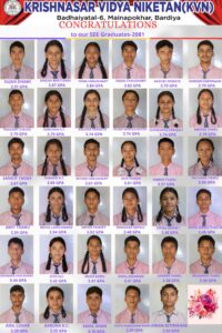 बर्दियाको बढैयाताल ६ मैनापोखरमा रहेको कृष्णसार बिद्या निकेतनले २०८१ सालको एस. ई. ई. परिक्षामा जिल्ला मै उत्कृष्ट नतिजा सहित सत् प्रतिशत बिद्यार्थी उतिर्ण गराउन सफल भएको छ । एस.ई. ई. परीक्षामा सम्मेलित ३५ जना बिद्यार्थीहरु मध्ये सत् प्रतिशत बिद्यार्थी उतिर्ण भएको बिद्यालयका प्रधानध्यापक नगेन्द्र भण्डारीले बताए । उतिर्ण बिद्यार्थी मध्ये सुजन धामी ३.९१ जिपिए ल्याएर जिल्लामै उत्कृष्ट भएको उनले बताए । उतिर्ण हुने बिद्यार्थी मध्ये १६ जना बिद्यार्थी ए प्लास (३.६–४) ग्रेड, १६ जना बिद्यार्थी ए (३.२–३.६) ग्रेड र ३ जना बिद्यार्थी बी प्लस (२.८–३.२) ग्रेड ल्याएर उतिर्ण भएको बिद्यालयले जानाएको छ । बिद्यालयले एक दशकदेखि एस. ई. ई. मा उत्कृष्ट नतिजा सहित सत् प्रतिशत बिद्यार्थी उतिर्ण गराउँदै आएको छ । २०७१ साल देखि नै सत् प्रतिशत बिद्यार्थी उतिर्ण गराउदै आएको बिद्यालयका प्रधानध्यापक भण्डारीले बताए । बिद्यालयमा अध्ययनरत् छात्र अबसर केसीले गत बर्षको एस. ई.ई.मा उत्कृष्ट नतिजा सहित जिल्ला प्रथम समेत भैसकेकाछन् । बिद्यालयको व्यवस्थापन, अनुभवि तथा दक्ष शिक्षक, बिद्यार्थीलाई निरन्तर अभ्यास तथा निगरानी , बिद्यालयको शिक्षामैत्री बाताबरण दिएकाले निरन्तर एस. ई. ई. मा सत् प्रतिशत बिद्यार्थी उतिर्ण गराउन सफल हुदैं आएको बिद्यालयका कार्यकारी प्रमुख ईश्वरी रिजालले बताए । बिद्यालयले उतिर्ण हुने सम्पुर्ण विद्यार्थीलाई बधाई तथा उत्तरोत्तर प्रगतिको कामना गर्नुका, साथै यस अवस्थासम्म पु¥याउन योगदान दिने सम्पूर्ण शिक्षक, कर्मचारी तथा अभिभावकलाई धन्यवाद समेत दिएको छ ।