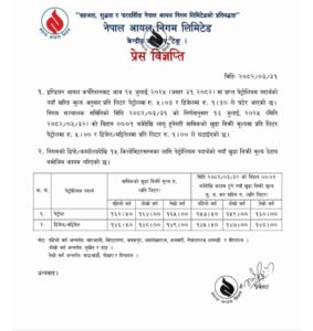 काठमाडौं । नेपाल आयल निगम लिमिटेडले मंगलबार राति १२ बजेपछि लागु हुने गरीपेट्रोलियम पदार्थको मूल्य घटाएको छ ।