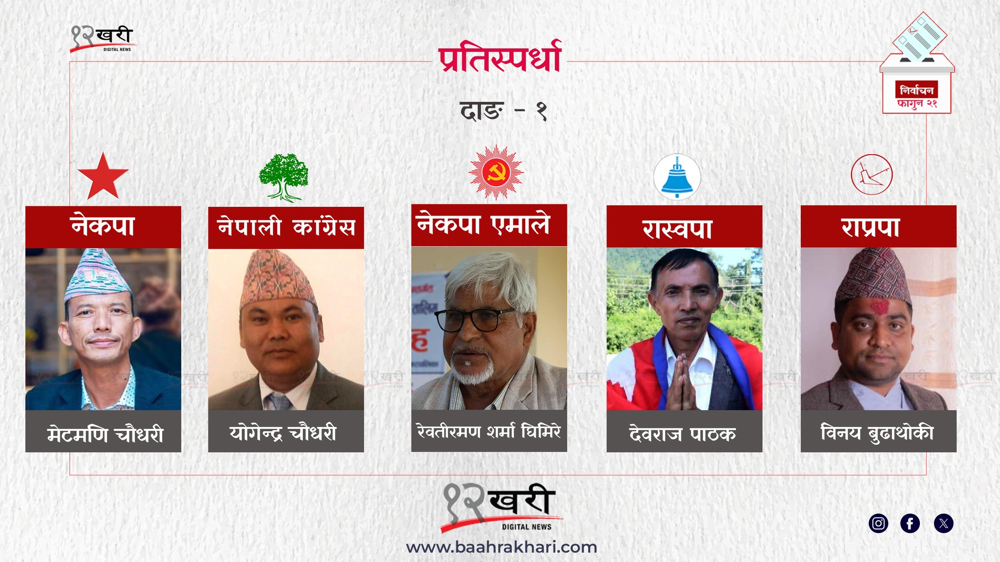 फागुन २१ गते हुने निर्वाचनका लागि क्षेत्र नं. १ मा दुईजना स्वतन्त्र उमेदवारसहित १४ जना प्रतिस्पर्धामा छन् । नेपाली कांग्रेसका सहमहामन्त्री योगेन्द्र चौधरी, नेकपा (एमाले)का नेता एवं लुम्बिनी प्रदेशसभाका पूर्वसदस्य रेवतीरमण शर्मा, नेपाली कम्युनिस्ट पार्टी (नेकपा)का नेता एवं पूर्वमन्त्री मेटमणि चौधरी, राष्ट्रिय स्वतन्त्र पार्टीबाट देवराज पाठक उमेदवार बनेका छन् ।