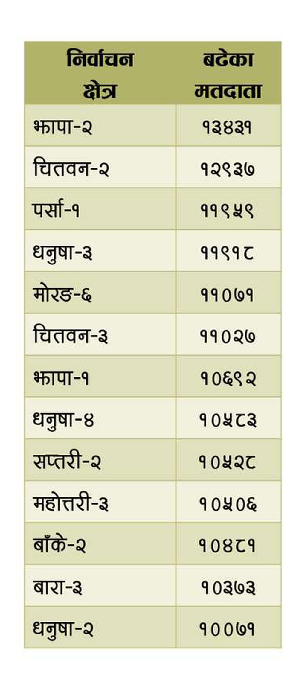 बाँके— बिहीबार हुन गइरहेको प्रतिनिधिसभा निर्वाचनमा करिब ९ लाख मतदाता थपिएका छन् । निर्वाचन आयोगद्वारा प्रकाशित अन्तिम मतदाता सूचीअनुसार १३ निर्वाचन क्षेत्रमा १० हजारभन्दा बढी मतदाता थपिएका छन् ।