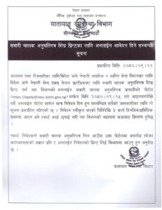 निवेदकले सवारी चालक अनुमति पत्र लिन आउँदा उक्त पोर्टलमा अपलोड गरेका कागजातको सक्कल प्रति र अनलाइन निवेदनको प्रिन्ट लिई विभागमा जानु पर्ने समेत सूचनामा उल्लेख छ ।