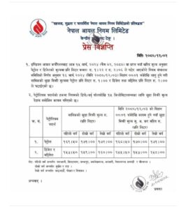 यस्तै डिजेल र मट्टितेलको पहिलो वर्गमा १५५ रुपैयाँ ५० पैसा, दोस्रोमा १५७ र तेस्रोमा १५८ रुपैयाँ कायम गरिएको छ ।