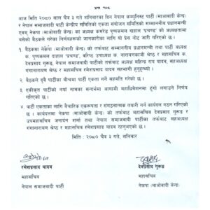 साथै, पार्टी एकताका लागि वैचारिक एकरुपता र संगठनात्मक तयारीका लागि कार्यदल पनि गठन गरेको छ ।