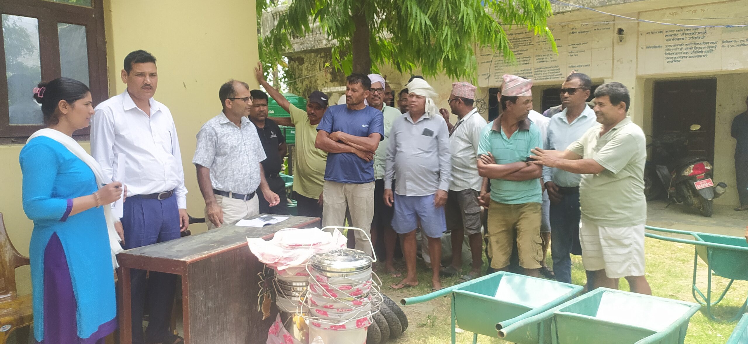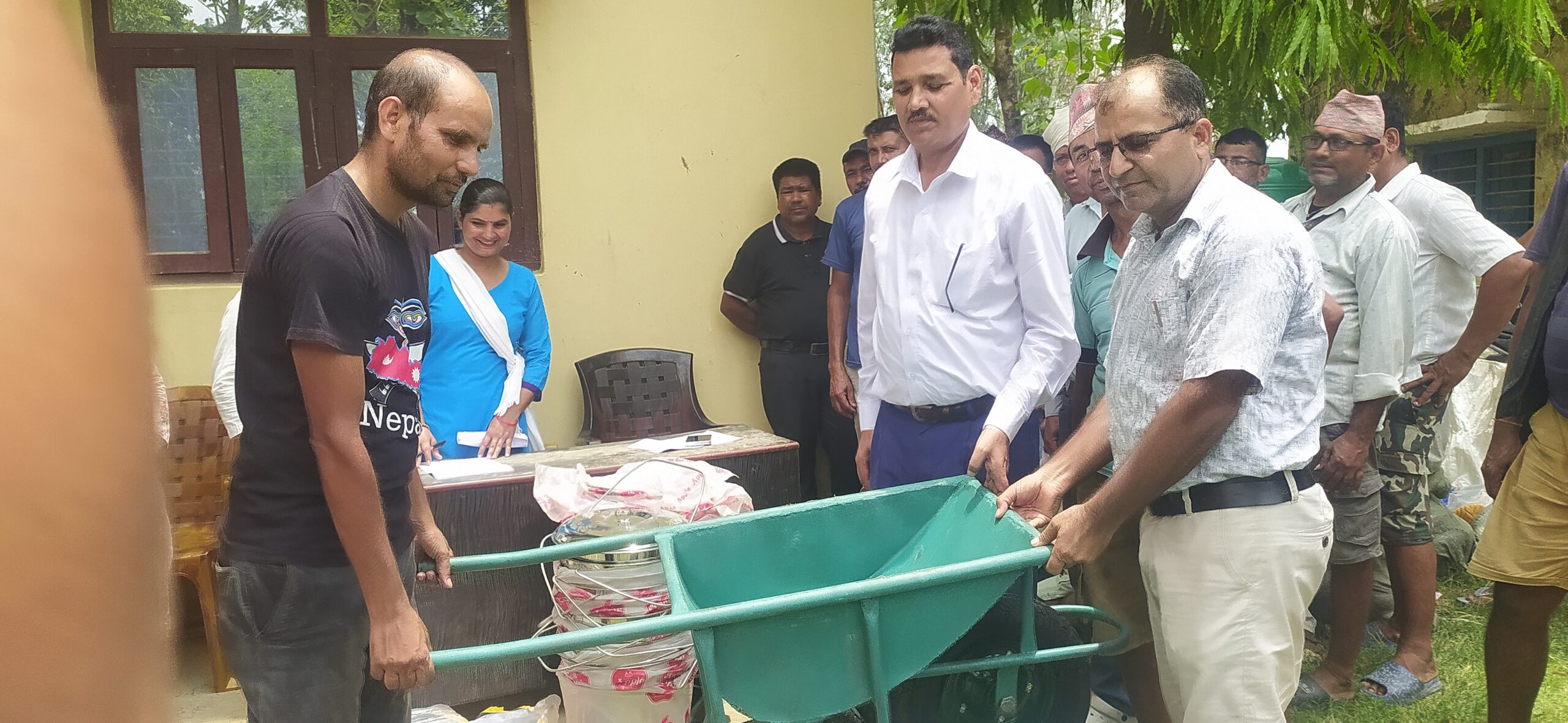 ८ नं वडा कार्यालयको आयोजनामा भएको सामाग्री वितरण कार्यक्रममा ४७ जना किसान लाई ७० प्रतिशतमा एक पांग्रे ठेला र १९ जना लाई ९५ प्रतिशत छुटमा स्टिलको वाल्टी र पानी वुट वितरण गरिएको वडाले जनाएको छ ।